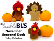Turkey Collection is available in limited supply throughout November 2025. It features 3 options for turkey accessories. Each Turkey comes with a squishy pumpkin. Buy one and get a second 20% off.